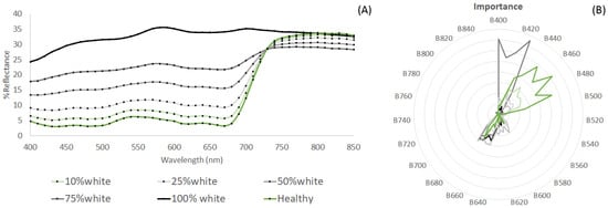 Hyperspectral signatures of K. alvareezi showing a gradient of white discolouration of the thallus: (A) Average spectra of healthy, mixed and entirely white thallus. (B) Diagram of wavelengths’ relative importance for characterising thallus whitening.