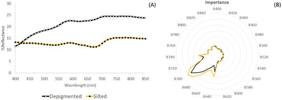 (A) Comparison of silted and depigmented E. denticulatum spectra. (B) Diagram of relative wavelengths’ importance for differentiating silted and depigmented thallus.