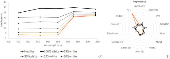 A gradient of E. denticulatum spectra was obtained, ranging from healthy thalli with no signs of whitening to those totally depigmented (Figure 3). A white thallus was characterised by a monotonous flat spectral shape in the VIS-NIR range and a higher albedo (Figure 3A). Wavelengths in the blue (400–440 nm), green (540–560 nm) and red (650–670 nm) parts of the visible spectrum showed the greatest importance in differentiating healthy, mixed and white Eucheuma thalli (Figure 3B). In particular, green and red wavelengths were associated with discriminating healthy Eucheuma, while blue and red wavelengths were more important for classifying intermediate stages of depigmentation.