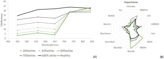 Spectral signatures of E. denticulatum degraded at the multispectral resolution of a DJI Phantom 4 multispectral sensor. (A) Average spectra of healthy, mixed and fully depigmented thallus. (B) Diagram of wavelengths’ relative importance for characterising the thallus whitening.