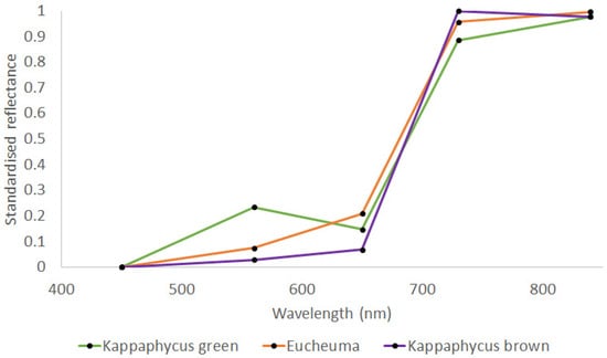 The spectral library used for classifications considers ideal cases of spectral shapes without interference from environmental effects. Such effects include water layer effects, background albedo and challenging illumination []. In particular, the results from this study are valid for emerging macroalgae, i.e., when spectral sampling occurs in the air. Eucheumatoids can be exposed at low tide but are often submerged in the sub-surface when cultivated. The spectral shape can be significantly influenced by water depth and constituents, particularly in the NIR range [,]. Therefore, specific radiometric corrections are necessary for accurately detecting and quantifying crop conditions in submerged situations [,,]. The background albedo poses another challenge in accurately characterising macroalgae. Nearby objects surrounding the specimens under examination will likely affect the classification results if they exhibit a similar spectral response. This problem commonly arises when seaweeds are cultivated alongside other algae or seagrasses on the seabed. Illumination is another crucial factor in characterising seaweed with spectral data. Poor illumination means that low reflectance samples (e.g., brown Kappaphycus or silted macroalgae) may be incorrectly identified. Over-illumination is the opposite problem, where high-intensity responses interfere with the spectral shapes. This typically occurs in aerial imaging when the sun glint from the water surface contaminates the image [,]. Despite these constraints, the spectral approach proposed in this study should be tested at the scale of cultivation plots using hyper- or multispectral drones at a very high spatial resolution [].