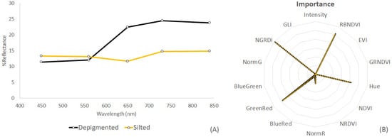 (A) Comparison of silted and depigmented E. denticulatum spectra degraded at the multispectral resolution of a DJI Phantom 4 multispectral sensor. (B) Diagram of relative wavelengths’ importance for differentiating silted and depigmented thallus.