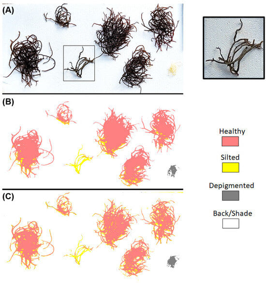 Regular crop condition assessment (e.g., daily or weekly) involves collecting macroscopic information about the health of the macroalgae thallus, typically through visual examination or photographs. Various management decisions can be made based on visible crop condition indicators []. This assessment is crucial for the early detection of health issues in macroalgae. In Eucheumatoids algae of the genus Kappaphycus sp. and Eucheuma sp., the main signs include (a) silting, (b) epiphytes or epizoa, (c) grazing marks and (d) disease-causing colour changes. They can directly or indirectly make crops vulnerable to pathogens or indicate disease symptoms affecting the thallus [,]. Silting occurs in poorly circulating, turbid waters and directly impacts the photosynthetic ability of macroalgae, leading to reduced yields. Under stressed conditions, it can also promote the development of ice-ice disease (IID) [,]. Epiphytes and endophytes impact both the quantity and quality of the biomass [,]. Grazing is a major cause of yield loss, contributing to macroalgae stress and disease, as mechanical injuries on the thalli open the way for pathogens [,]. IID is the most common syndrome in Eucheumatoids, caused by unfavourable environmental conditions (temperature and salinity) followed by a bacterial infestation [,]. Its main symptom is loss of pigmentation, leading to a gradual whitening and hardening of the thalli [,,]. IID is a major yield-limiting factor and has caused significant economic damage recently [,,]. Although there are several studies on IID in Eucheumatoids, no effective approach has been developed for the early detection of IID symptoms using optical sensors. A regular and automated crop condition assessment would be important to increase biomass yield and strengthen the biosecurity of macroalgae aquaculture [,,,,].