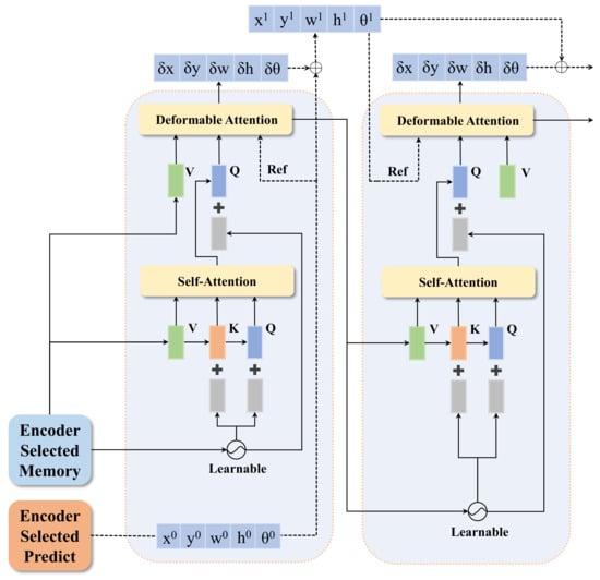 The decoder in our proposed detector largely follows the decoder in Deformable DETR, with modifications made to the iterative refinement part to accommodate rotations. Our decoder’s structure is illustrated as shown in Figure 2.