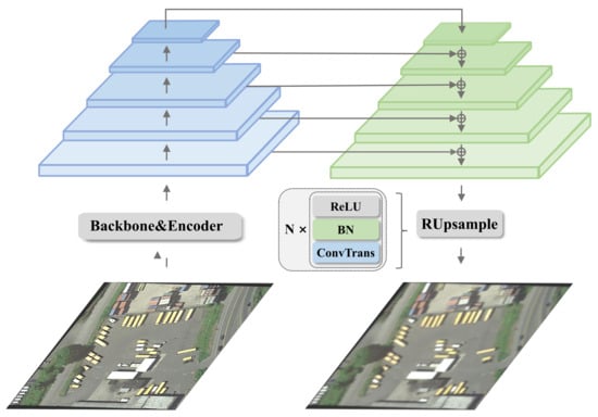 Illustration of the IFR module of the proposed DETR-ORD method. Given the feature maps that have been processed by the backbone and hybrid encoder and restored to multiple scales, we adopt an architecture similar to the FPN to fully integrate multi-scale features, obtaining the feature map with the smallest downsampling factor. Then, through N RUsample modules, we obtain features of the original image size. The RUsample modules consist of transposed convolution, batch normalization (BN), and ReLU activation.