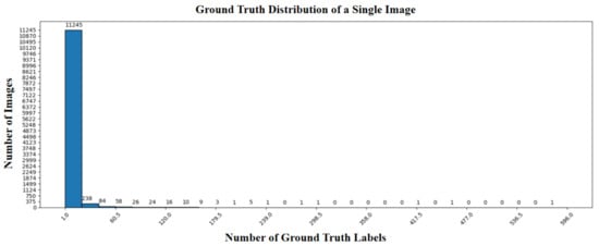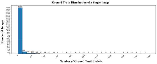 The DIOR-R [38] dataset is a re-annotated version of the DIOR dataset’s images. The DIOR-R dataset contains a total of 23,463 images and 192,518 ground-truth annotations. Each image in the dataset has a size of 800 × 800 pixels, with spatial resolutions ranging from 0.5 m∼30 m. The training and validation sets combined consist of 11,725 images, while the test set includes 11,738 images. The dataset covers 20 categories: Airplane (APL), Airport (APO), Baseball Field (BF), Basketball Court (BC), Bridge (BR), Chimney (CH), Expressway Service Area (ESA), Expressway Toll Station (ETS), Dam (DAM), Golf Course (GF), Ground Track Field (GTF), Harbor (HA), Overpass (OP), Ship (SH), Stadium (STA), Storage Tank (STO), Tennis Court (TC), Train Station (TS), Vehicle (VE), and Windmill (WM) [38]. The distribution of ground-truth annotations per image in the dataset is shown in Figure 5.