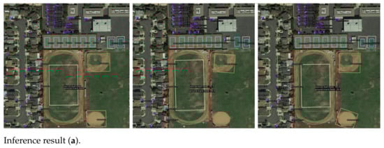 We also selected visualization results of the detectors pre- and post-improvement to demonstrate the effectiveness of the improvements, as shown in Figure 7 and Figure 8. The inference results are divided into three parts: the leftmost image shows the ground-truth annotations, the middle image shows the inference results of the detector before improvement, and the rightmost image shows the results after improvement. Figure 7 displays the inference results on DOTA-v1.0. From Figure 7a, it can be seen that in scenes with densely distributed image targets, the improved detector maintains the detection performance for small targets (small vehicles) while showing better performance for other targets. From Figure 7b, it is evident that in scenes with sparsely and repetitively distributed targets, the improved detector achieves higher detection rates and better detection quality.