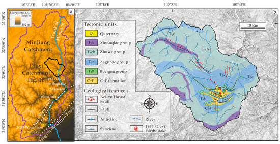 Geomorphic and geological settings of the Diexi Catchment []. (a) Topographic map of the Diexi Catchment (black boundary) within the Minjiang Catchment (purple boundary); (b) geological map of the Diexi Catchment. Detailed description of lithological units is shown in Figure 2.