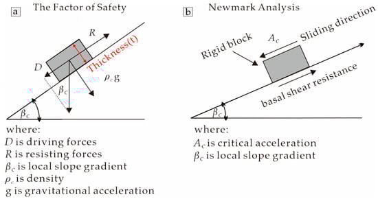 The Newmark model first calculates the factor of the safety/pseudo-static slope stability by defining the factor safety (FS), which describes the ratio of the shear resistance to the shear stress for downslope movements (Figure 3a). The safety factor (FS) is calculated as follows: