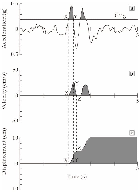 where g is the gravitational acceleration. The permanent displacement (Newmark displacement, DN) can be derived by calculating the double integral of AC, which is generally measured using a real-time seismic accelerometer (Figure 4).