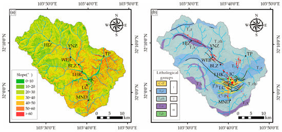 Maps of (a) slope gradients and (b) lithologic groups. (Detailed parameters are shown in Table 1). The black capitalized letters represent abbreviations for place names as follows: HJZ—Huoji; YNZ—Yini; WEB—Waer; BLZ—Baila; LHK—Lianghe; JC—Jiaochang; LC—Longchi; MND—Manaoding; TP—Taiping.