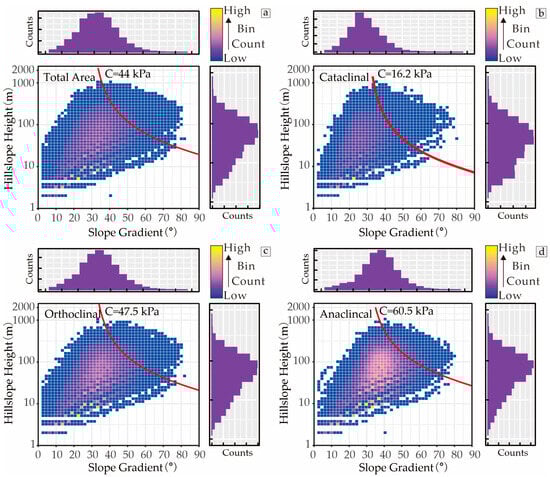 Back-calculations of different slopes’ structural types in the Diexi Catchment: (a) total study area; (b) cataclinal slope; (c) orthoclinal slope; (d) anaclinal slope.