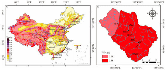 Maps showing the PGA with an exceedance probability of 2%. (a) Location of the Diexi Catchment on the CPSHA map. (b) Distribution of the PGA in the Diexi Catchment.