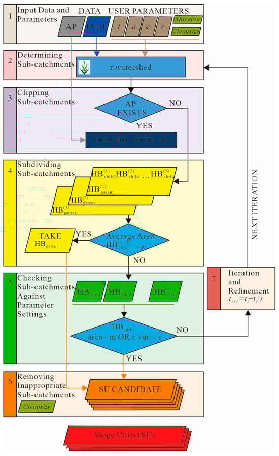 Step 1 (Input data and parameters): The data include the flat terrain’s distribution map (AP) and DEM of the study area. The parameters to be set include the threshold catchment area (t), the minimum area of the slope unit (a), the minimum slope aspect’s difference coefficient within the same slope unit (c), the reduction coefficient (r), the maximum slope unit’s area (maxarea), and the minimum threshold area for removing candidate slope units (cleansize). Step 2 (Determining sub-catchments): The reduction coefficient (t) is used for dividing the study area into several sub-catchments (half-basins, HBs) based on the r.watershed module in the GRASSGIS environment. Step 3 (Clipping sub-catchments): Checking whether the half-basins (HBs) generated in step 2 are located in flat areas. Step 4 (Subdividing sub-catchments): Divide each half-basin (HB) into several half-basins subdividing areas (HB_subs), and compare the average area within the study area with the value of a. If the area of each HB_sub is smaller than a, use the watershed unit (HB); otherwise, proceed to the next step. Step 5 (Checking sub-catchments against parameter settings): Determine whether the area of HB_sub is smaller than a or if the slope aspect’s difference coefficient is less than c. If this condition is met, proceed to step 6; otherwise, go to step 7 for parameter reconfiguration. Step 6 (Removing inappropriate sub-catchments): Based on the results from the previous step, enter the iterative phase to update the initial catchment area threshold. Step 7 (Iteration and refinement): Based on the value of cleansize, remove polygons from the candidate slope unit’s set that are smaller than the threshold. Repeat this process until the subdivision of a sub-watershed is reasonable.