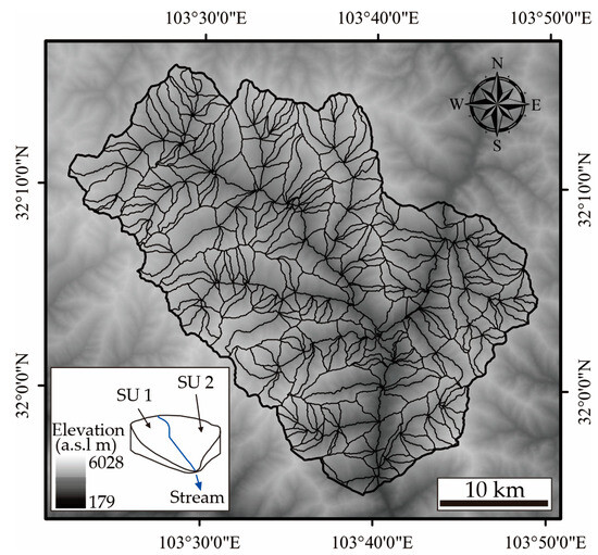 Following the steps mentioned above, a minimum watershed area of 2.7 km2 (cleansize) was used for the SU’s automatic subdivision. The slope units in the Diexi Catchment were ultimately delineated, as shown in Figure 10. The slope units are consistent with the slope aspect, indicating that the subdivision results are reasonable.