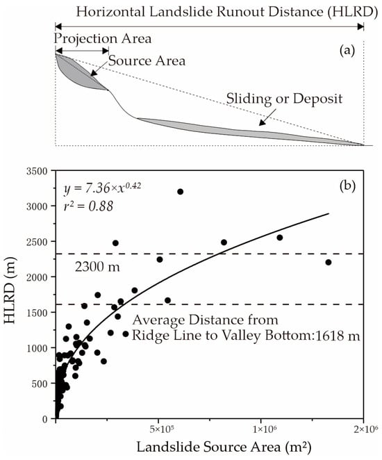 Illustration of landslide runout and relationship between landslide area and runout distance. (a) Sketch of landslide source area, sliding area, and deposit area; (b) landslide runout distance plotted as a function of the landslide source area for the Diexi Catchment.