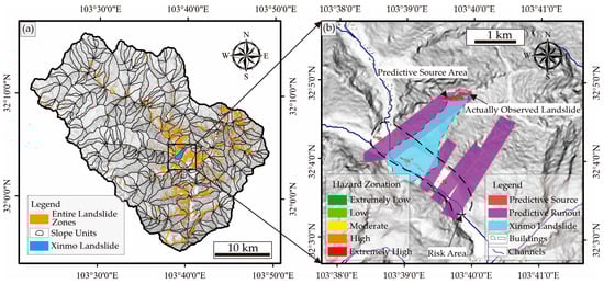 As shown in Figure 15, these potentially unstable landslide source areas were updated by identifying fresh landslide scars within the landslide boundary, which is used for predictive accuracy testing. The 1933 MW 7.3 Diexi Earthquake triggered landslides covering an area of 44.76 km2 [] (Figure 15a). The potentially unstable landslide source areas are identified with an area of 4.5 km2. This is comparable to the seismic landslide source area caused by the Diexi Earthquake, which had an area of 7.6 km2 (Figure 15b). These observations verify the identified landslide source area, enabling us to test predictive accuracy by comparing the predictions with the observations.