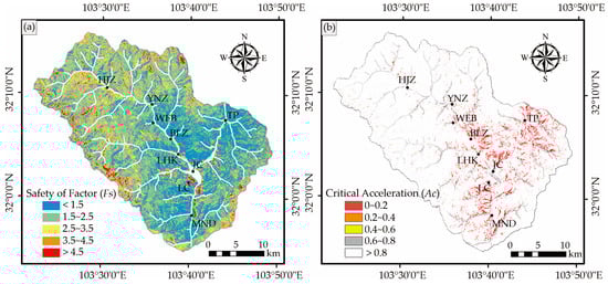 Maps showing the distributions of the hillslope safety factor and critical acceleration: (a) static hillslope safety factor (FS); (b) critical acceleration (AC). The lower values indicate high susceptibility to landslides.