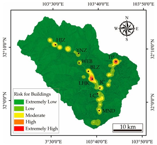 The Jenks Natural Breaks Method on the ArcGIS platform is applied to determine the level of the potential distance. Hazard levels are classified by the distance between infrastructures and the nearest potential landslide. Table 2 shows detailed classifications of infrastructural risks, including those to buildings and roads. Using distance-weighted kernel density analysis, hillslopes not covered by landslides but actually in danger are classified as high-risk or extremely high-risk zones (Figure 13).