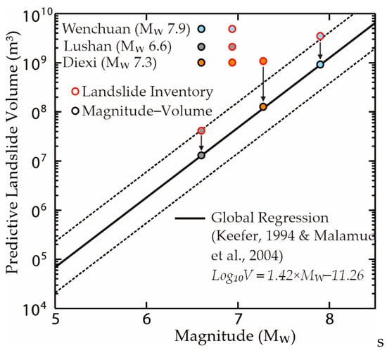 However, the landslide volume induced by the Diexi Earthquake, as estimated using the magnitude–volume formula, tends to be underestimated. This is because the Diexi Catchment is a rapidly uplifting mountainous area with frequent tectonic activities, which can result in deep-seated landslides and, thus, produce higher landslide volumes than areas with low tectonic activity []. This is corroborated by previous studies, which found that magnitude–area-based landslide volumes were four times lower than the landslide-inventory-based landslide volumes for the 2008 MW 7.9 Wenchuan and 2013 MW 6.6 Lushan Earthquakes [] (Figure 19). According to the landslide inventories from previous studies, the Diexi-Earthquake-induced landslide volume is estimated to be between 1.20 and 1.91 × 109 m3. Despite uncertainties caused by different parameters and landslide interpretations, this estimate is significant by a factor of ten higher than the magnitude–area-based landslide volume estimates [,]. This indicates that the estimation of the seismic landslide volume remains considerably uncertain because of the influences of deep-seated structures, seismically induced strength degradation, and undercutting valleys.