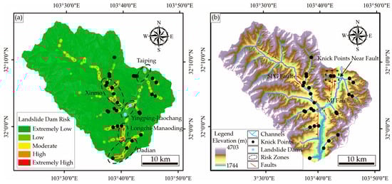 Mapping the spatial distribution of landslide dams is significant for post-seismic cascading-hazard risk estimations. The segments of channels covered by the entire landslide zone, including the sliding and deposit areas, are extracted as points to map the landslide-dam-risk area based on kernel density analysis on a GIS platform (Figure 20). The seismic-landslide-dam-risk map shows that the high-risk and extremely high-risk zones cluster into five main groups: in the Xinmo, Yingping–Jiaochang, Taiping, Longchi–Manaoding, and Dadian areas (Figure 20a). These areas spatially match well with knickpoints, generally thought to be formed by lithologies, landslide dams, and tectonic activities, including faults and tectonic uplifts. Fan et al. [] conducted a detailed field investigation, illustrating that landslide dams are responsible for these knickpoints (Figure 20b). After excluding three knickpoints near the Minjiang Fault, the number of knickpoints corresponding to the risk zones is assessed as follows: an extremely high-risk zone with eight knickpoints, a high-risk zone with five knickpoints, a moderate-risk zone with eight knickpoints, a low-risk zone with three knickpoints, and an extremely low-risk zone with four knickpoints. The extremely high-risk and high-risk zones have 13 knickpoints, accounting for 50% of the total knickpoints, supporting the reliability of the evaluation outcomes.