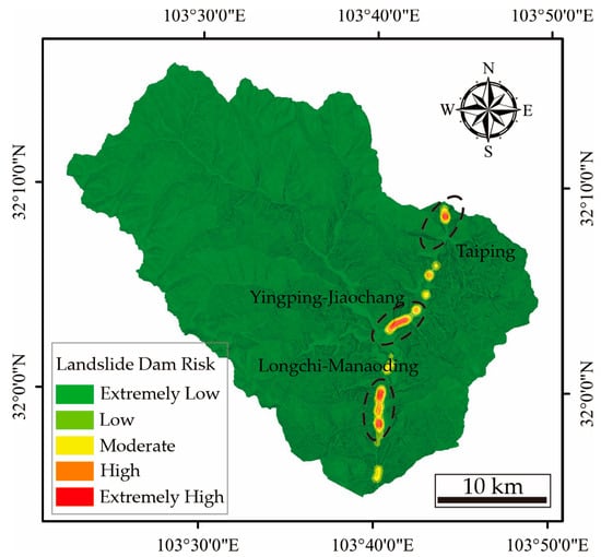 Streams that tended to be blocked by landslides were identified as those with sufficient flow to form significant impoundments. The Minjiang River is the largest river in the Diexi Catchment. The 1933 Diexi Earthquake caused landslide dams that blocked the river and later breached. The estimated volume of the material released from the three main dams (the Diexi Ancient Town landslide, the Jiaochang landslide, and the upstream Yinpingya rock collapse) is approximately 370.9 × 104 m3. The flood peak propagated at a speed of 26 km/h, affecting areas as far downstream as Xinjin County, 260 km from Diexi []. Consequently, we focus on the landslide dam risks of the Minjiang River. The results indicate that in the Minjiang River section, the areas with the highest risk of landslide dams are primarily concentrated in the Yinpingya–Jiaochang area, the Taiping area, and the Longchi–Manaoding area (Figure 21). These areas will require close monitoring in the future for post-earthquake landslide dam risks and dam-break outbursts.