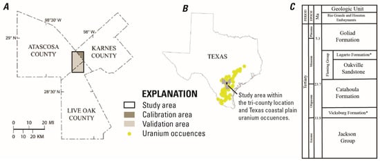 Study area with calibration and validation areas (A) at the intersection of Karnes, Atascosa, and Live Oak Counties within the Texas Coastal Plain uranium mining region (B), and stratigraphy within the study area (C), modified from Hall et al. (2017) [] (* denotes units not discussed in the text and are shown for stratigraphic context).
