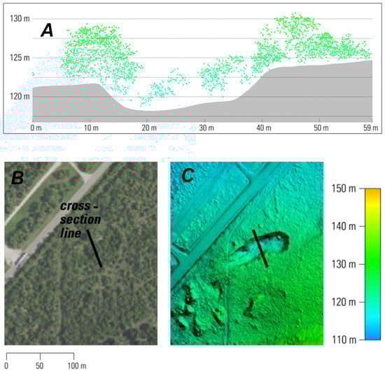 An example of the Lidar point cloud cross-section revealing (A) the Boso-Hackney mine pit from underneath the vegetation cover otherwise not apparent in (B) multispectral imagery true-color visualization. The bare earth elevation surface is extracted from the (C) Lidar point cloud.