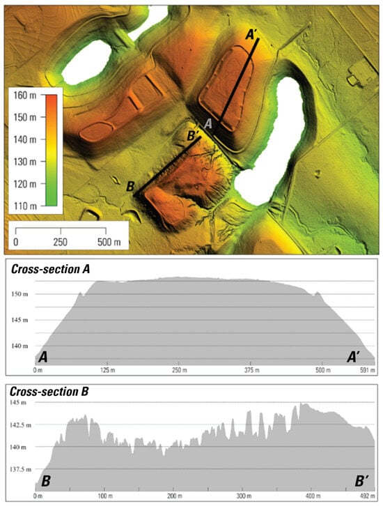 Lidar laser scanning penetrates the vegetation canopy to measure the bare earth surface topographic elevation and often reveals anthropogenic modifications to the landscape, such as mine excavation pits and waste pile features, and areas that were disturbed by mining operations (Figure 3). Bare earth DEMs were derived from pre-classified ground returns using the Global Mapper Create Elevation Grid tool. All non-terrain surface features present on the landscape (e.g., buildings and vegetation) were removed when generating the final DEM. The bare earth DEMs (e.g., Figure 3) were generated at the same spatial resolution as their original Lidar point cloud. Radiation at NIR wavelengths is absorbed by water, therefore the absence of Lidar ground returns is an indicator of the presence of surface water. Gaps in ground returns were intentionally retained surface to reveal pit lake features (Figure 5). Mine feature geometry and volumes were derived using this bare earth DEM data. The resulting Lidar bare earth DEM products and the detailed processing steps are documented and published in a USGS Data Release []. Topographic contour vectors were derived from the bare earth DEM and calculated at 5 m intervals using the Global Mapper Create Contours tool. Topographic contours helped aid in qualitative visual interpretation, thereby further helping us in identifying and differentiating between reclaimed and abandoned mine features (Figure 4C).