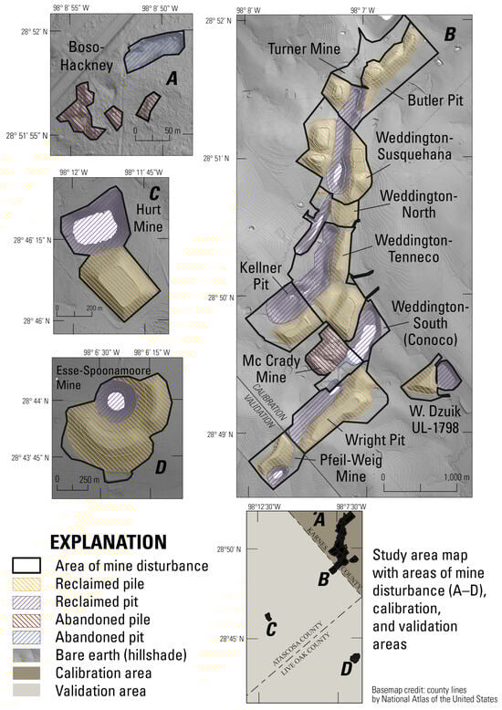 Although extensive records documenting the location and extent of mine pits and waste-rock piles, along with descriptions of reclamation activities are available for some mines, other mines were abandoned with little to no such documentation. The Department of Energy’s U.S. Producing Uranium Mines database does not always track production to specific mines; therefore, the number and precise location of mine features are not always known []. The occurrence of undocumented mines is a global issue; basic knowledge of mine inventories and surveys is useful for studying environmental health risks and impacts [] and evaluating the resource potential of mining and mine waste. According to the RRC, 23 known uranium mine pits were abandoned within Karnes, Atascosa, and Live Oak Counties prior to 1975 [], though previous studies document a higher number [,]. Uranium production left a legacy of open-pit mining features, such as pit craters and waste-rock piles, which are still evident in modern-day digital topographic and remote sensing data [].