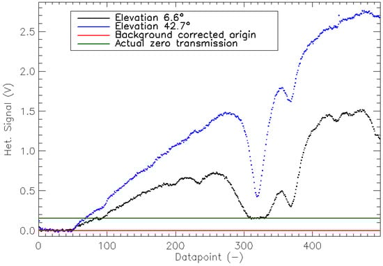 Background anomaly of the Laser Heterodyne spectro-Radiometer. The black curve shows the CH4 lines at low solar elevation, and the blue curve shows the measurements at mid-solar elevation angles. The red line indicates the background corrected origin, while the green line is the actual zero transmission.