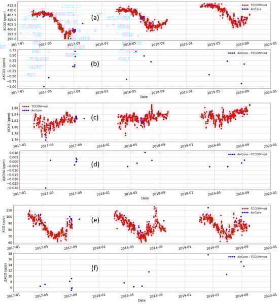 Time series of XCO2 (a), XCH4 (c), and XCO (e) retrieved from AirCore and the TCCON instrument for measurements performed at Sodankylä during the period of 2017–2019, and their differences (AirCore minus TCCON) ΔXCO2 (b), ΔXCH4 (d), and ΔXCO (f) for the same period.