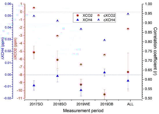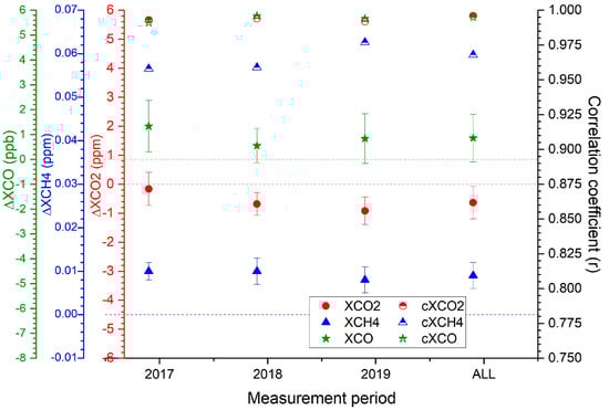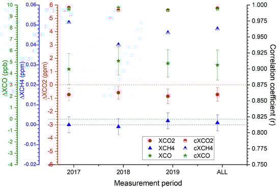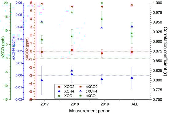 Mean bias (solid points), standard deviation of the difference (error bars), and correlation coefficients (open points) for XCO2 (red), XCH4 (blue), and XCO (green) calculated from the EM27/SUN relative to the TCCON for the individual years of the campaign as well as the averaged combined results of all years.