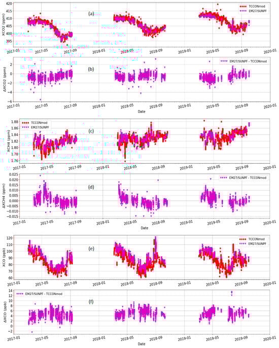 Time series of XCO2 (a), XCH4 (c), and XCO (e) retrieved from EM27/SUN and TCCON instruments for measurements performed at Sodankylä during the period of 2017–2019, and their differences (EM27/SUN minus TCCON reference) ΔXCO2 (b), ΔXCH4 (d), and ΔXCO (f) for the same period.