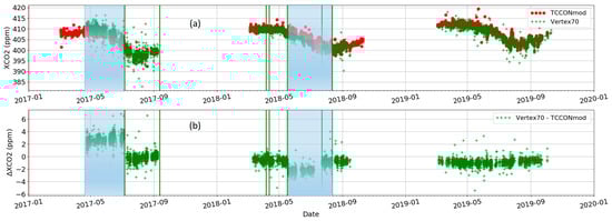 Time series of XCO2 (a) retrieved from Vertex70 and TCCON instruments and their differences (Vertex70 minus TCCON reference) (b) for the same period. The shaded areas represent the time periods where the instrument was not operated in an optimal condition, and some tests were performed to achieve better results. The vertical bars represent the dates when an instrument modification was performed to the Vertex70 during the campaign.