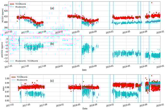 Time series of XCO2 (a) and XAir (c) retrieved from IRCube and TCCON instruments and their difference of ΔXCO2 (IRCube minus TCCON reference) (b) for the same period. The vertical bars represent the dates when an instrument modification was performed to the IRCube during the campaign.