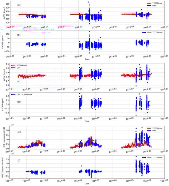 Time series of XCO2 (a), XCH4 (c), and XH2O (e) retrieved from LHR and TCCON instruments for measurements performed at Sodankylä during the period of 2017–2019, and their differences (LHR minus TCCON reference) ΔXCO2 (b), ΔXCH4 (d), and ΔXH2O (f) for the same period.