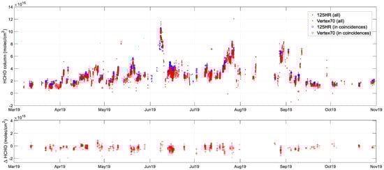 Time series of the retrieved HCHO columns at Sodankylä from the 125HR (blue) and the Vertex70 (red) spectrometers for all measurements (points) and for data in coincidences within 15 min (circles). Bottom: the differences of the HCHO columns Vertex70—125HR for the data in coincidences.