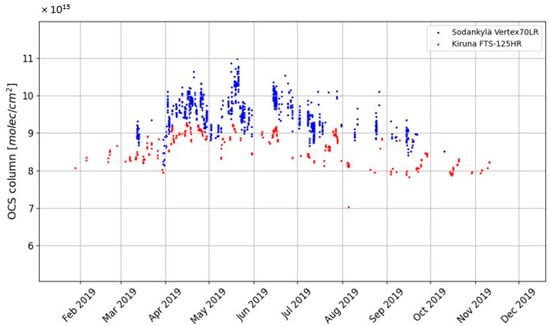 Recently, the AirCore technique has been further developed to additionally obtain vertical profiles of N2O and OCS. For the former, a dedicated N2O analyzer (Picarro, Inc., Santa Clara, CA, USA, model G5310) is inserted inline upstream of the G2401 []. For the latter, both in Kiruna (August 2021) and Sodankylä (August 2023), AirCore samples were analyzed using a quantum cascade laser spectrometer (QCLS; Aerodyne Research Inc., Billerica, MA, USA, model TILDAS-CS), allowing for simultaneous measurements of OCS, N2O, CO2, CH4, and CO []. Precision for OCS (1σ of individual samples collected at 1 Hz) of the QCLS is better than 20 ppt, with an accuracy of ±40 ppt on the NOAA scale. Preliminary profiles for OCS are derived and will be presented in a separate manuscript (in preparation). These profiles will be very useful and allow a comparison of OCS total columns between FTIR and AirCore.