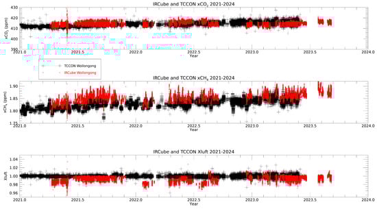The mean bias, standard deviation of the difference, and correlation coefficient of the Xgas values calculated from the IRCube relative to the TCCON for each year and the average of the three years are plotted in Figure 9. The variability of the XCO2 bias was already clear in Figure 8b. Figure 9 also shows the variability of the bias in the XCH4 values from the IRCube measurements relative to the TCCON at the different locations and the poor correlation coefficients. The bias in the XCH4 for Darwin is close to zero (0.002 ppm), while the XCO2 bias is very high (−10.487 ppm). At the end of the three-year campaign, IRCube data were not comparable to the reference TCCON or the EM27/SUN, and therefore, further work is needed to improve its performance. This is discussed in Section 3.4.