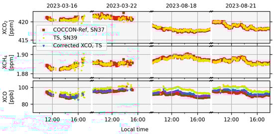 Xgas values from the side-by-side measurements with the COCCON reference spectrometer (SN37) and the TS (SN39) at the Karlsruhe TCCON site. The two days in March and two days in August were collected before and after the visit to the Izaña TCCON site.