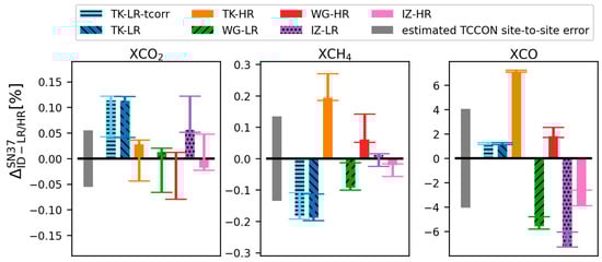 From the side-by-side measurements, the bias compensation factors for the HR and the LR data relative to the TS data are derived (, ) for each species. By multiplying them by the bias compensation factors (derived above), we obtain a bias compensation factor that describes the deviation of the Izaña TCCON site relative to the reference spectrometer in Karlsruhe (). These factors can be converted into a relative deviation and are plotted in Figure 18.