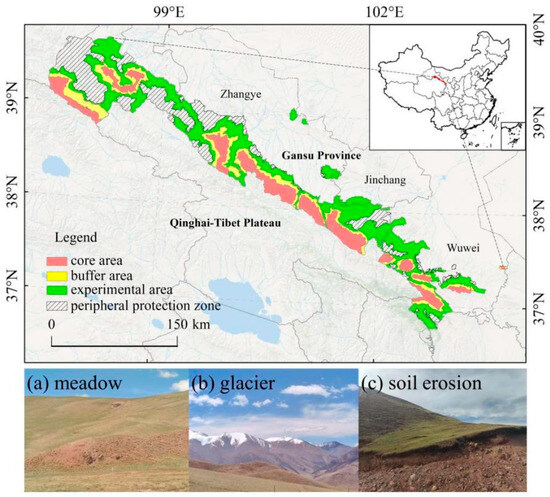 The QMNNR (97°23′34″~103°45′49″N, 36°29′57″~39°43′39″E), spanning a total area of 2.65 × 104 km2, was established by the State Council of the People’s Republic of China in 1988 (Figure 1). The total area of the reserve is approximately 2.65 × 104 km2, which is divided into the core area (5.05 × 103 km2), buffer area (3.87 × 103 km2), and experimental area (1.09 × 104 km2). The reserve encompasses diverse ecological resources, including forests, meadows (Figure 1a), rivers, and glaciers (Figure 1b), and boasts rich biodiversity. Most of the reserve is situated at elevations ranging from 3000 to 3500 m above sea level, with an average annual rainfall of approximately 350–500 mm, primarily occurring between June and September. The Qilian Mountains serve as an ecological security barrier and a critical area for biodiversity conservation in the Hexi Corridor. Significantly, environmental challenges, including grassland degradation (Figure 1a), glacier melting (Figure 1b), and soil erosion (Figure 1c), within the reserve have escalated [26,27].