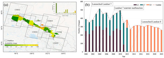 Strip and quantitative distribution of Landsat images in the QMNNR from 2000 to 2022. (a) Spatial distribution of Landsat images and (b) temporal distribution of Landsat images.