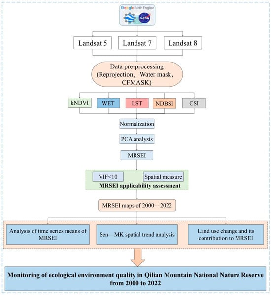 In accordance with the environmental characteristics of the Qilian Mountains, this study integrated the MRSEI was combined with land use changes to investigate the spatial-temporal variations in the ecological and environmental quality of the QMNNR from 2000 to 2022, as illustrated in Figure 3. Initially, the kNDVI and CSI were incorporated to develop the MRSEI, and the applicability of the MRSEI was subsequently assessed. Secondly, the dynamic characteristics of ecological quality in the QMNNR were assessed using Sen-MK spatial trend analysis and the mean time series of MRSEI. Finally, the influence of land utilization types on the ecological environment quality of the reserve was analyzed by utilizing the contribution rate index of the MRSEI and evaluating the changes in land use area.