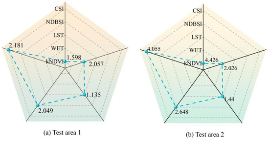 So as to validate the applicability of the MRSEI in the reserve, two test areas were selected based on land use types (Figure 4). Test area 1 primarily consisted of desert and sparse vegetation, while test area 2 was predominantly characterized by dense vegetation.