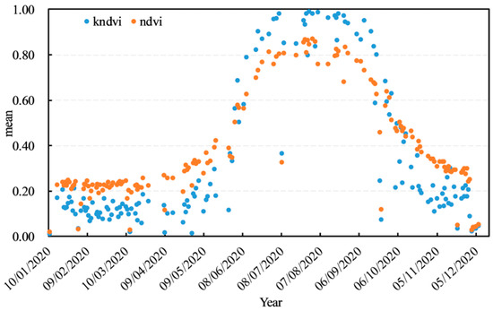 Comparative analysis of NDVI and kNDVI during the growing season in the QMNNR in 2020.