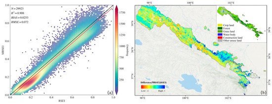 (a) Correlation between MRSEI and RSEI and (b) difference spatial distribution.