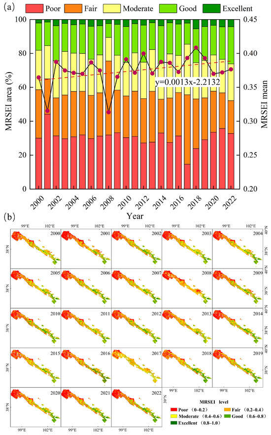 (a) The average value of MRSEI and the area proportion of the QMNNR and (b) Spatial distribution in the MRSEI from 2000 to 2022.