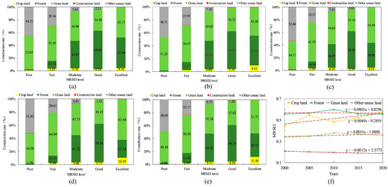 Contribution rates of various land use types in the QMNNR to MRSEI ratings in (a) 2000, (b) 2005, (c) 2010, (d) 2015, and (e) 2020, and (f) changes in MRSEI under the influence of cropland, forest, grassland, and other unused land.